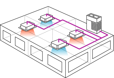 Daikin developed a unique refrigerant circuit that minutely regulates the refrigerant flow for both heating and cooling to achieve individual air conditioning even for buildings with both cooling and heating needs. Furthermore, the heat recovery operation utilizes exhaust heat during cooling operation and reuses it for heating to significantly increase energy savings. This achieved a comfortable indoor environment throughout the year by automatic change over between heating and cooling according to the set temperature.
