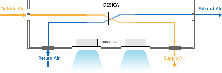 Conventionally, controlling humidity required a large amount of energy for reheating. For this reason, Daikin developed an air conditioning system with an individually treatment for latent and sensible heat, and this significantly reduced the air conditioner’s work by removing latent heat. Using the heat pump as heat source, DESICA employs a heat pump desiccant method to efficiently adsorb and release moisture into the air. Because humidification and dehumidification are performed without supply and drain piping, this revolutionary system saves installation piping and the owner does not need to care for water quality.