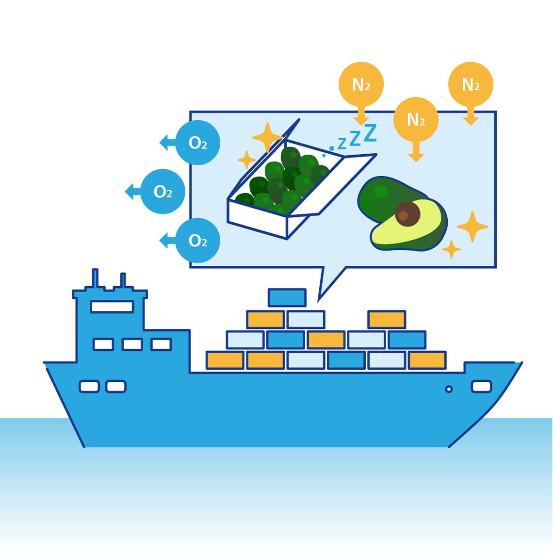 A less widely known fact is that harvested fruits and vegetables, like people, also breathe. As they do, they ripen and age before eventually losing their freshness. When being transported over long distances, their breathing can be suppressed by lowering the temperature inside the containers that carry the vegetables and fruits while extracting and injecting nitrogen from the outdoor air and discharging oxygen.