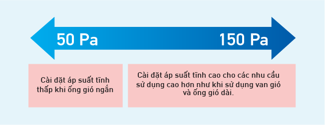 Sử dụng động cơ quạt DC có thể điều chỉnh áp suất tĩnh bên ngoài trong khoảng từ 50 Pa đến 150 Pa (FBFC100-140). Luồng gió dễ chịu đạt được tùy vào điều kiện như chiều dài ống gió.