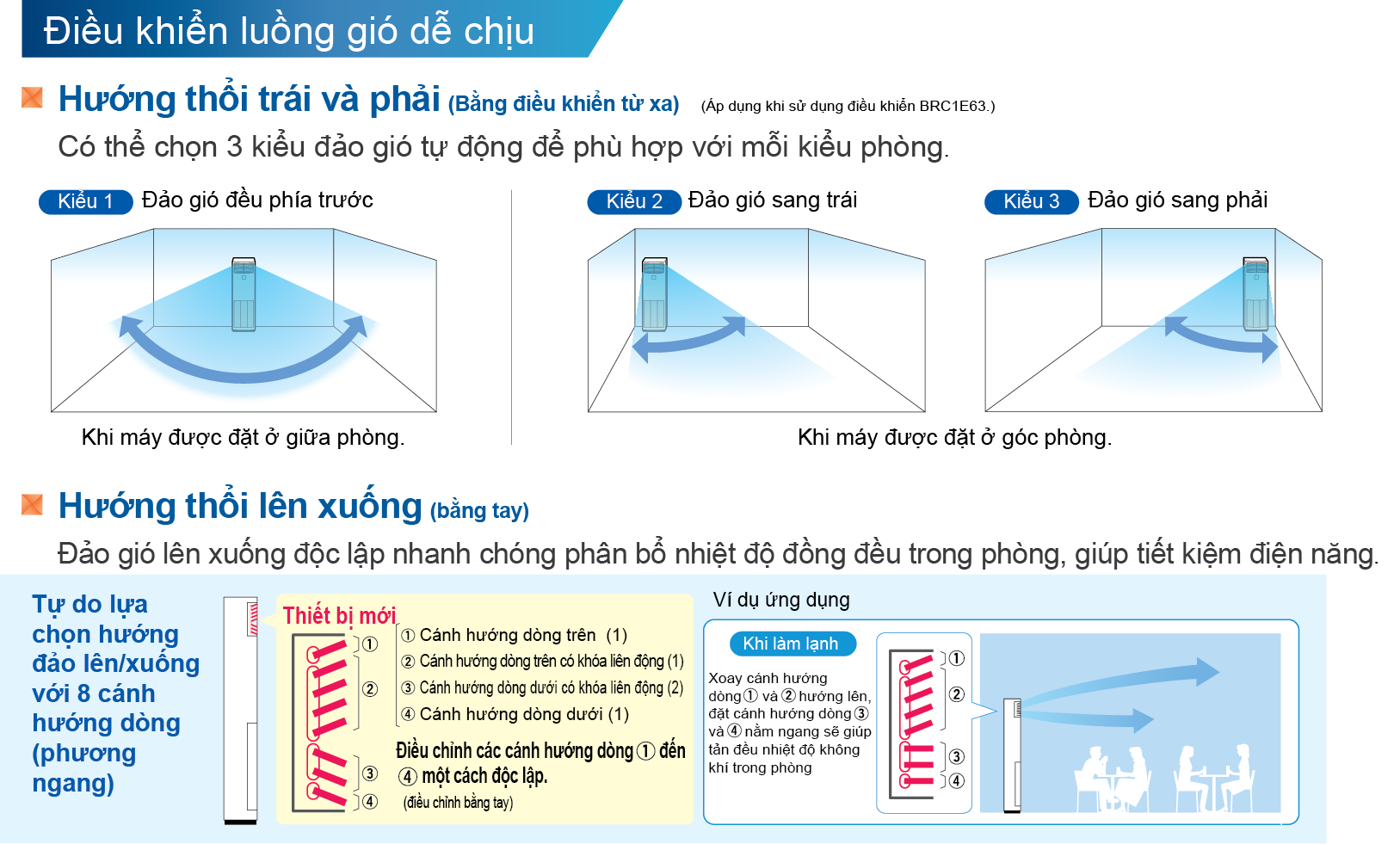 Đảo gió lên xuống độc lập nhanh chóng phân bổ nhiệt độ đồng đều trong phòng và tiết kiệm điện.