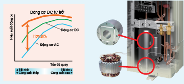 Dòng sản phẩm biến tần DC của Daikin được trang bị máy nén với DC từ trở. Động cơ này tiết kiệm năng lượng vì trong quá trình hoạt động nó cần ít điện năng nhưng vẫn sản sinh ra công suất lớn hơn động cơ AC và động cơ DC truyền thống.