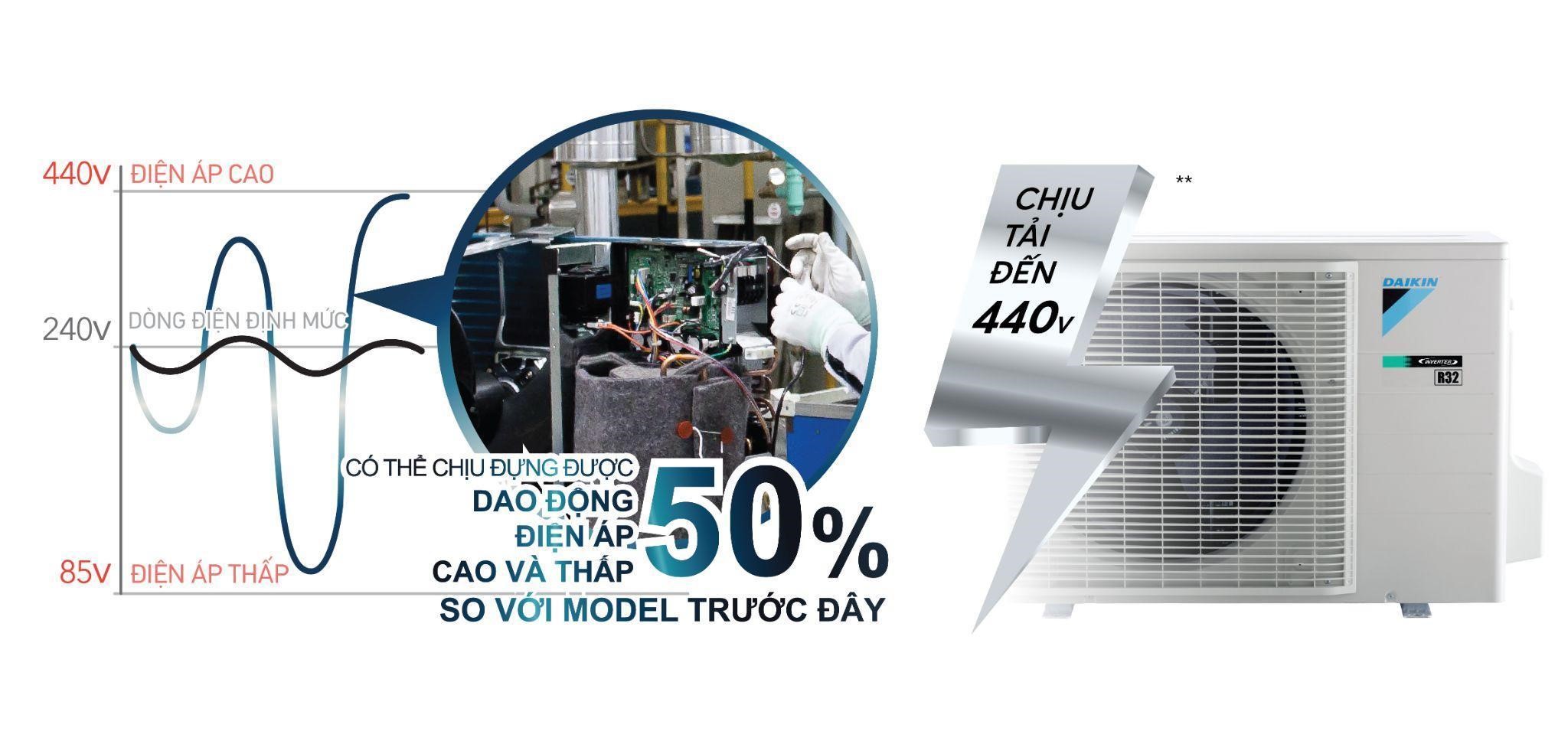 Dòng sản phẩm điều hòa không khí hai chiều FTHF của Daikin được trang bị một mạch điện tử có độ bền cao để có thể chịu đựng được điện áp lên đến 440 (V). Điều này cho phép chúng hoạt động trên một phạm vi rộng điện áp ở những khu vực có nguồn điện không ổn định. Mạch điện này sẽ loại bỏ sự cần thiết phải lắp thêm bộ ổn áp điện đồng thời tạo ra bảo vệ bổ sung cho các thiết bị trong dàn nóng như động cơ quạt và máy nén. Khi điện áp cao hơn hoặc thấp hơn phạm vi có thể hoạt động, hệ thống điều hòa không khí sẽ tự ngắt. Khi điện áp được điều chỉnh trở lại giá trị ban đầu, hệ thống tự động bắt đầu hoạt động trở lại.