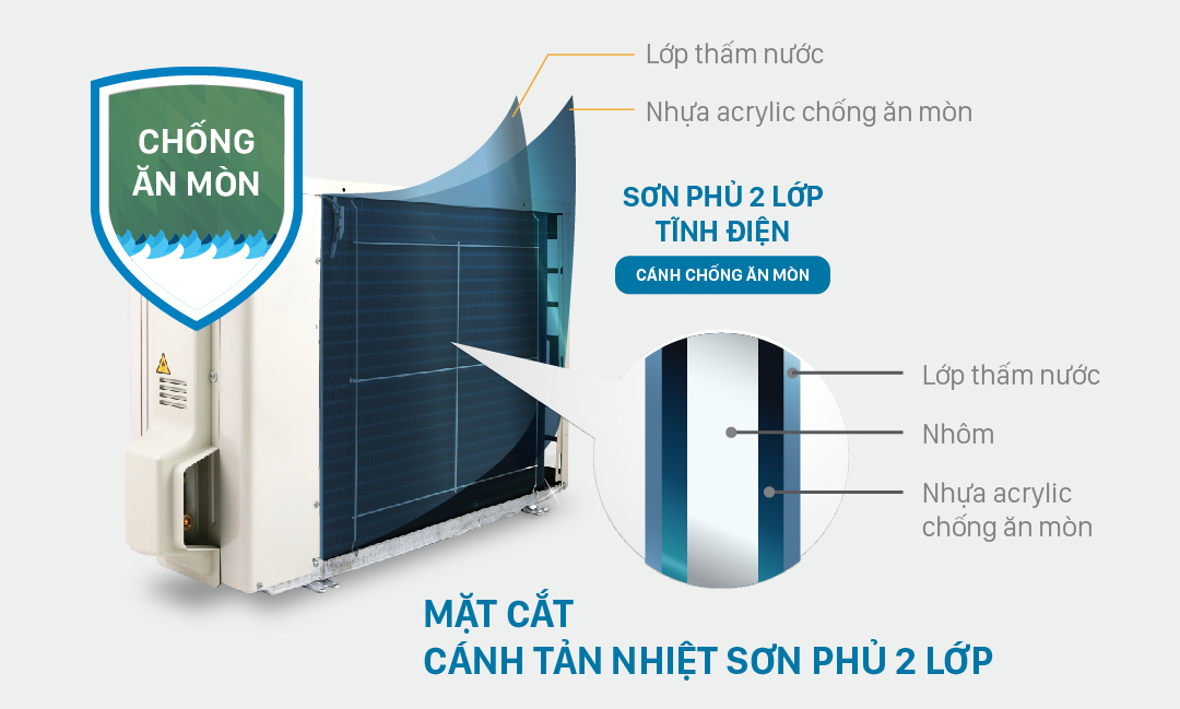 Bên cạnh đó, các cánh trao đổi nhiệt của dàn nóng được xử lý bằng cách chống ăn mòn đặc biệt. Bề mặt được sơn phủ 2 lớp tĩnh điện: lớp nhựa acrylic mỏng và lớp chống thấm nước để tăng khả năng chống mưa axit và sự ăn mòn của muối.