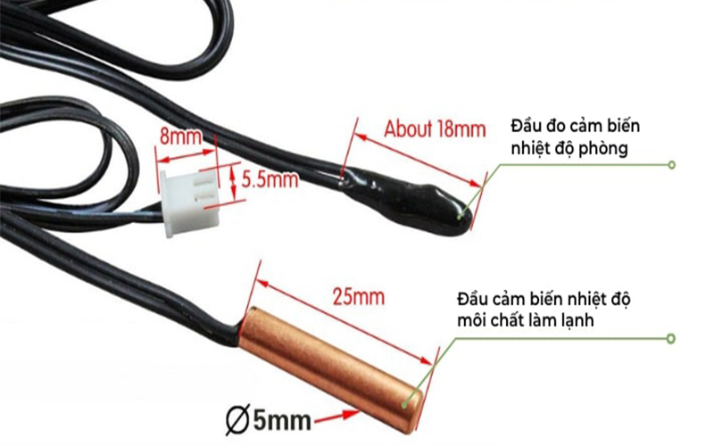 Cảm biến dàn lạnh là một bộ phận có kích thước khá nhỏ với 2 đầu cảm biến nhiệt điện trở như sau: