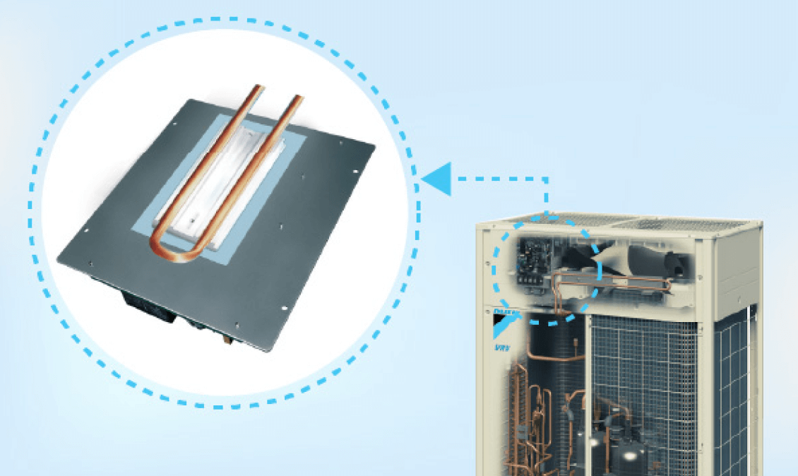 Sử dụng môi chất lạnh để làm mát mô-đun inverter sẽ giúp giảm thiểu kích cỡ của các thành phần điện tử, và nó giúp giảm sự cản trở dòng không khí và tăng hiệu suất cho máy.
